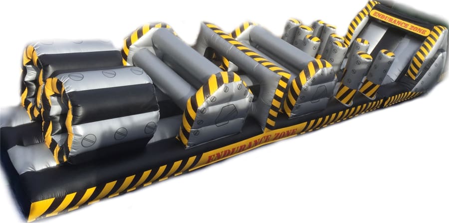 Introducing our fantastic 60 ft inflatable assault course , jump through hoops bash the bashers and flip through the letterbox to reach the slide to see who can be fastest on the Assault course . Then complete the Assault course in reverse to see who is the ultimate warriors,